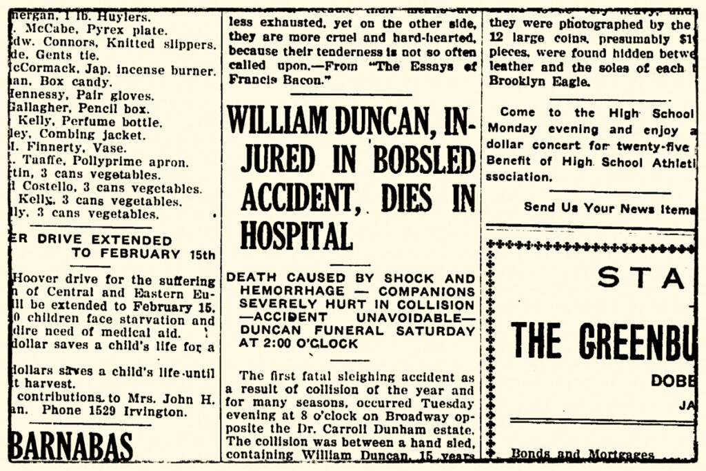 Two decades later casualties were still piling up. On Tuesday, February 1, 1921 around 8 pm, William Duncan and Fred Bliss were riding a “hand sled” on Broadway just south of Main Street in Irvington. Coming the other direction was what the Irvington Gazette described as “a large super-bob owned by David Murphy, Jr., and loaded with a party of young people.” When the larger, faster sled swerved to avoid an automobile, it collided with the smaller sled. Duncan received fatal internal injuries and Bliss was knocked unconscious. The bobsled party was thrown off, with several suffering severe injuries. Duncan was buried in Sleepy Hollow Cemetery not far from John O’Keefe.